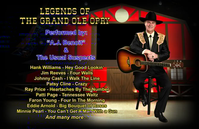 Singer A.J. Benoit "Mr. Entertainment" is one of Brockville, Ontario's most versatile entertainers and is well known for his sold out shows at The Brockville Arts Centre, Brockville Country Club and various venues throughout the region. Often referred to as being able to sing the phone book he performed many genres of music: Jazz, Crooner, Country, Celtic, Nfld & Maritime, Scottish (Robbie Burns Shows), Irish (St. Patrick's Day Shows), Oktoberfest Celebrations, Veteran Tribute Shows, 50's Rock n' Roll, Opera, Show Tunes, Sacred songs, and more. In 2020 A.J. was inducted into The Brockville and Area Music & Performing Arts Hall of fame.